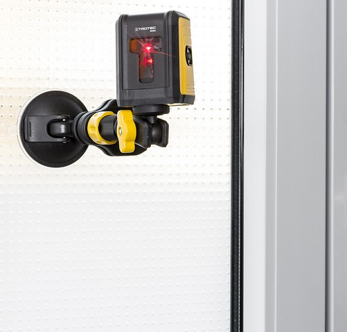 Requiere batería, lo que permite usarlo en cualquier lugar, proyecta una cruz láser en ángulo recto en la pared opuesta. Las líneas proyectadas son 100% rectas por lo que es autonivelante.